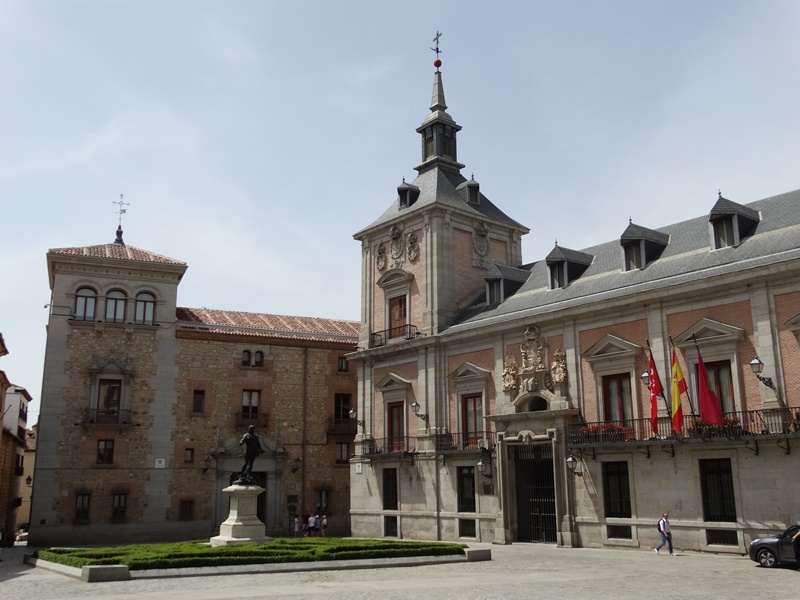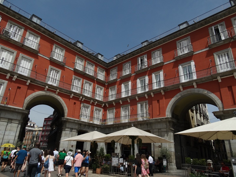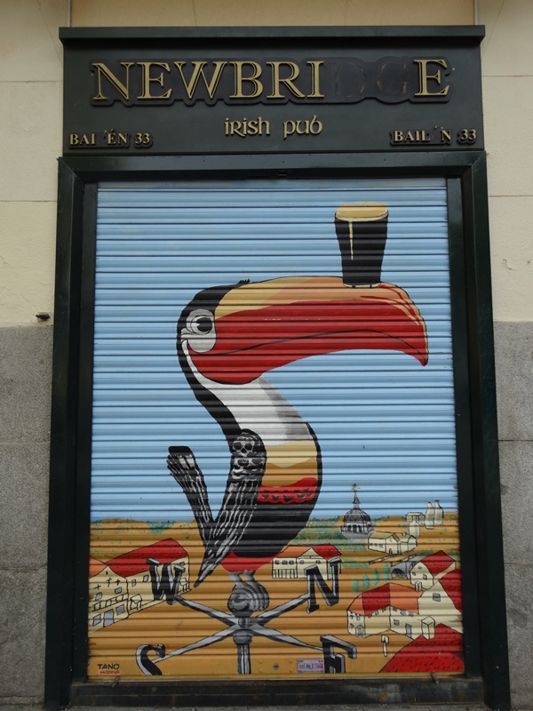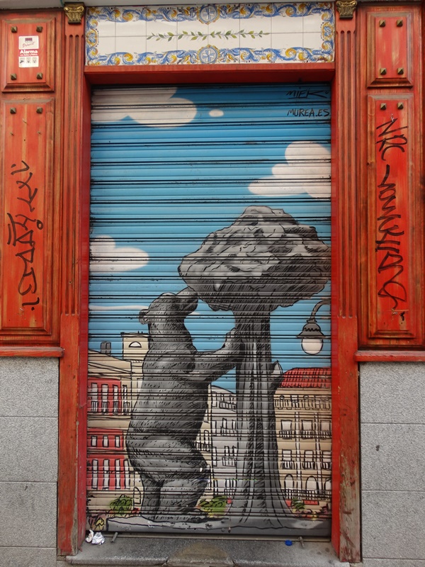Die Plaza Mayor ist hübsch. Ein wenig erschreckend ist der Gedanke, dass hier erst 1974 die letzte Exekution stattgefunden hat. Heute gibt es glücklicherweise nur noch Restaurants und ab und zu Konzerte. Schön sind auch die Illustrationen der Straßennamen, die überall hängen, seit Carlos III. den Analphabeten etwas Gutes tun wollte. Damals waren das noch fast alle Menschen in Madrid. Seither ist in der Ellenbogenstraße ein Ellenbogen auf dem Straßenschild gemalt. Leider ist die Calle Punonrostro, die Straße der Faust im Gesicht, nicht so anschaulich illustriert.