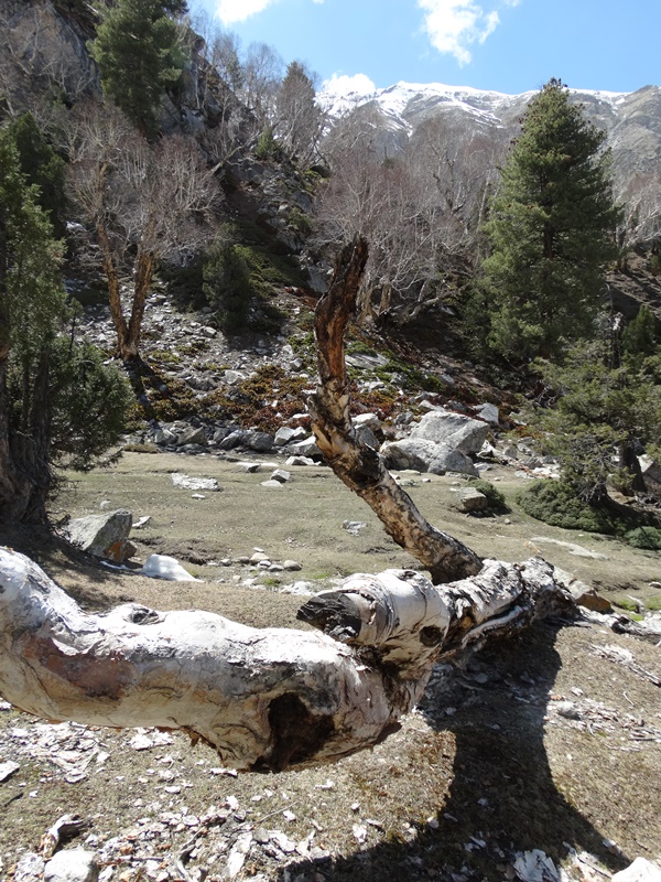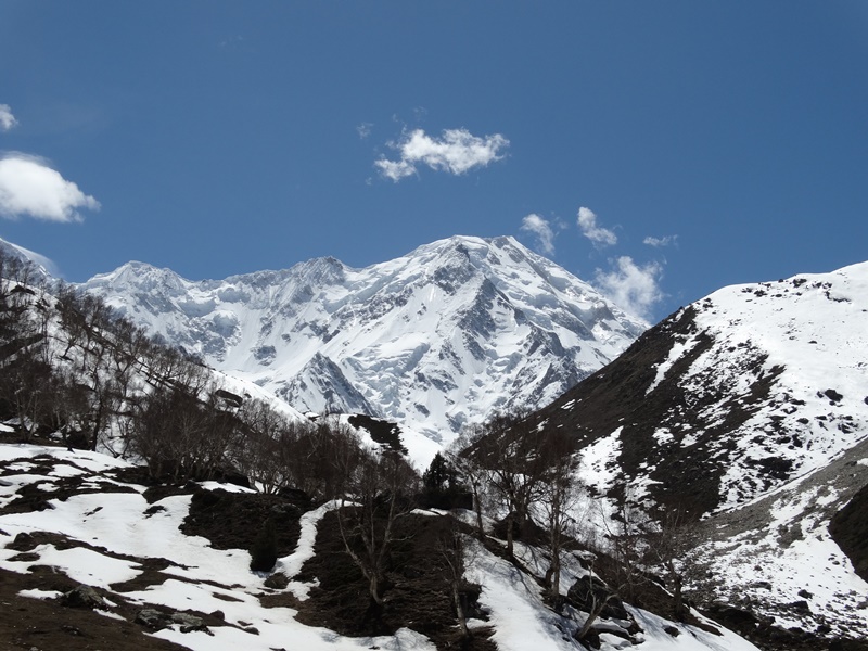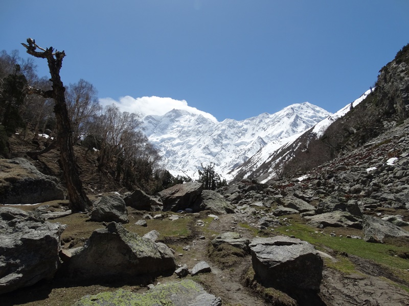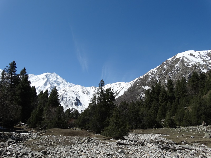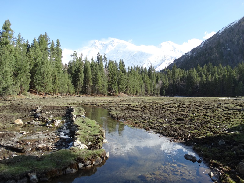 Die Märchenwiese ist jetzt im April ein sumpfiges Stückchen Land, das wenig märchenhaft wirkt, aber die Wiese ist umgeben von hohen dunklen Kiefern, hinter denen sich die gigantische Wand des Nanga Parbat erhebt. Von meinem Holzhäuschen aus sehe ich also eine Reihe Nadelbäume und dahinter den grandiosen Eisriesen, der mit seinen drei Gipfeln auf mich sehr imposant wirkt.
