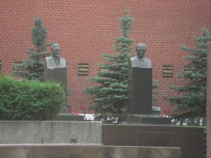 Das Mausoleum an sich, das an der Kremlmauer steht, ist aus rotem Marmor gebaut und von den Gräbern vieler russischer Helden umgeben. Hier ruhen einige Kosmonauten, die es zu Ruhm und Ehren gebracht haben und neben ihnen Joseph Stalin, der als tausendfacher Massenmörder ein wenig in Ungnade gefallen war. Bis vor einigen Jahren durfte er nämlich noch neben Lenin im Mausoleum liegen. Vorbei an den Ehrengräbern geht man eine kleine marmorne Treppe herab und befindet sich dann im eigentlichen Mausoleum. Alle paar Meter steht ein Soldat in dem dunklen Raum und treibt die Menschen zur Eile an. Ich flaniere vorbei an Lenin, der einbalsamiert in seinem Glassarg liegt und versuche, alle Eindrücke in mich aufzunehmen, so gut das im Vorbeigehen möglich ist. Nach wenigen Minuten ist der Spaß vorbei und ich stehe wieder im Sonnenlicht des Roten Platzes. Ich freue mich schon auf das nächste Mausoleum!