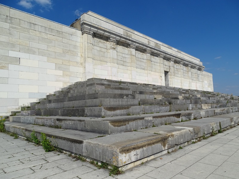 Das einzige, was tatsächlich auf dem elf Quadratmeter großen Gelände jemals genutzt wurde, ist das Zeppelinfeld, das sicher jeder aus dem Fernsehen kennt. Hier fanden von ab 1933 die Reichsparteitage statt. Imposante Inszenierungen mit einer Million Zuschauern, pompösen Paraden und motivierenden Reden vom Führer höchstpersönlich. Wer eine Führung mitmacht, kann auch in das Gebäude hinein, welches in den 60er Jahren seine weißen Kolonnaden eingebüßt hat, aber doch nicht gut zu erkennen ist. Innen sind goldene Hakenkreuze zu sehen. Die Räumlichkeiten wurden allerdings nie genutzt.