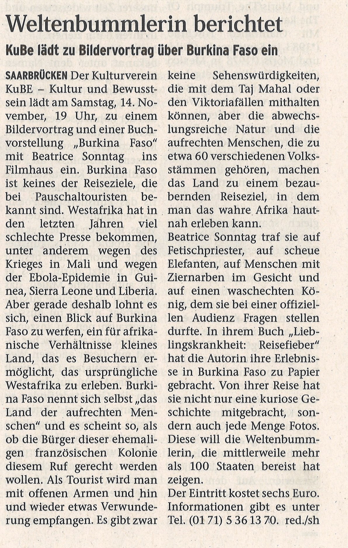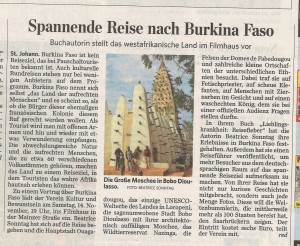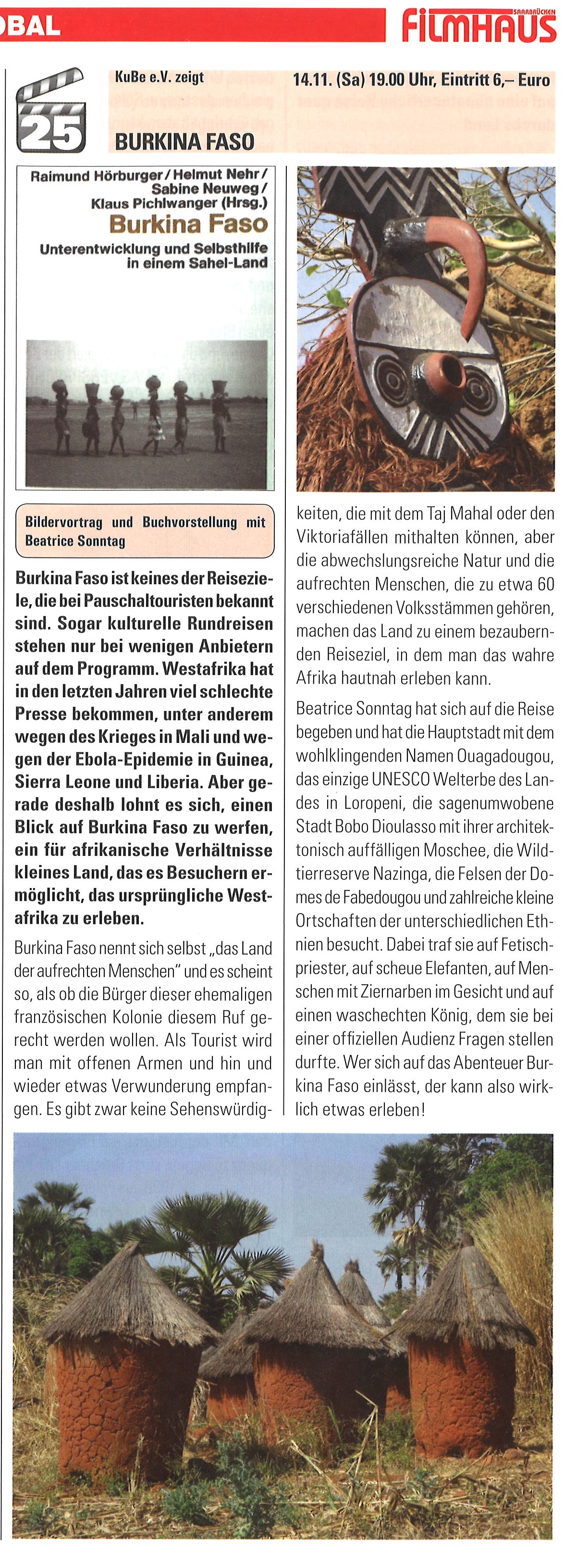 Ankündigung des Bildervortrages im Filmhaus Saarbrücken üer Burkina Faso 14.11.15