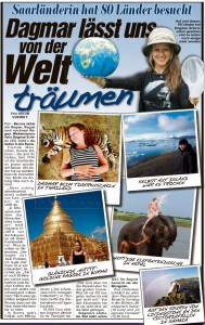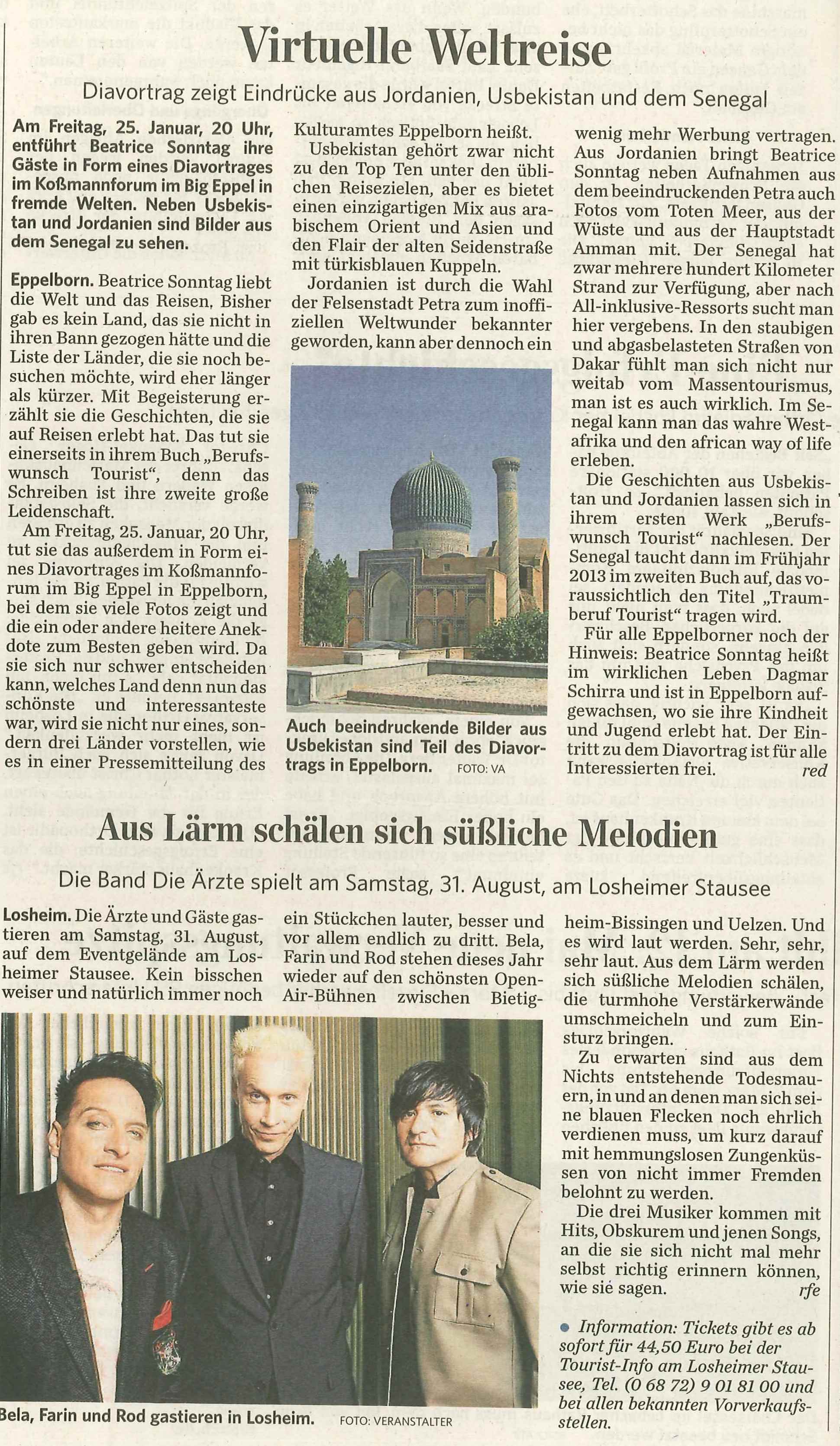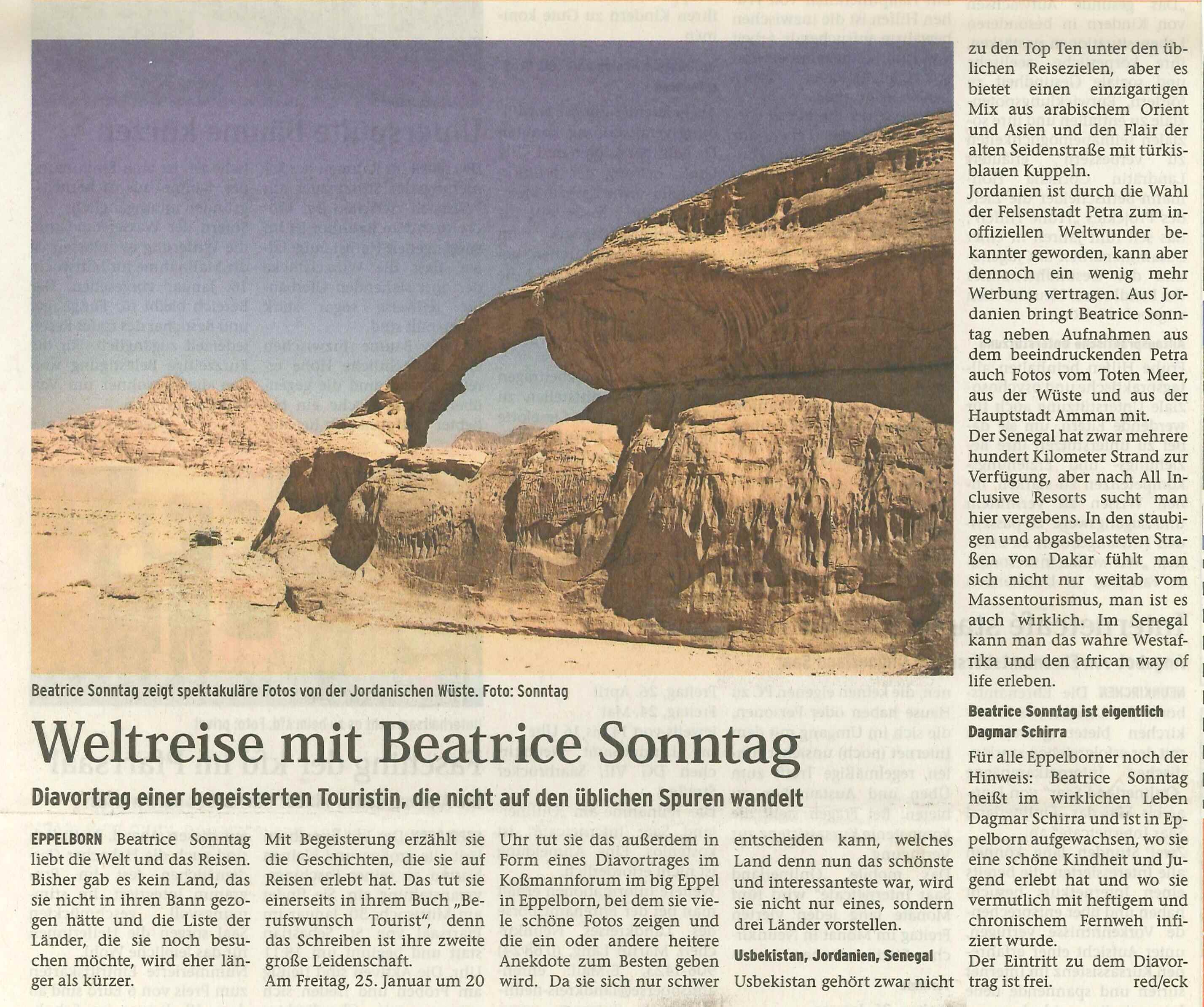 Vorankündigung „kleine Weltreise mit Beatrice Sonntag“ im Eppelborner Amtsblatt und im Wochenspiegel im Januar 2013: