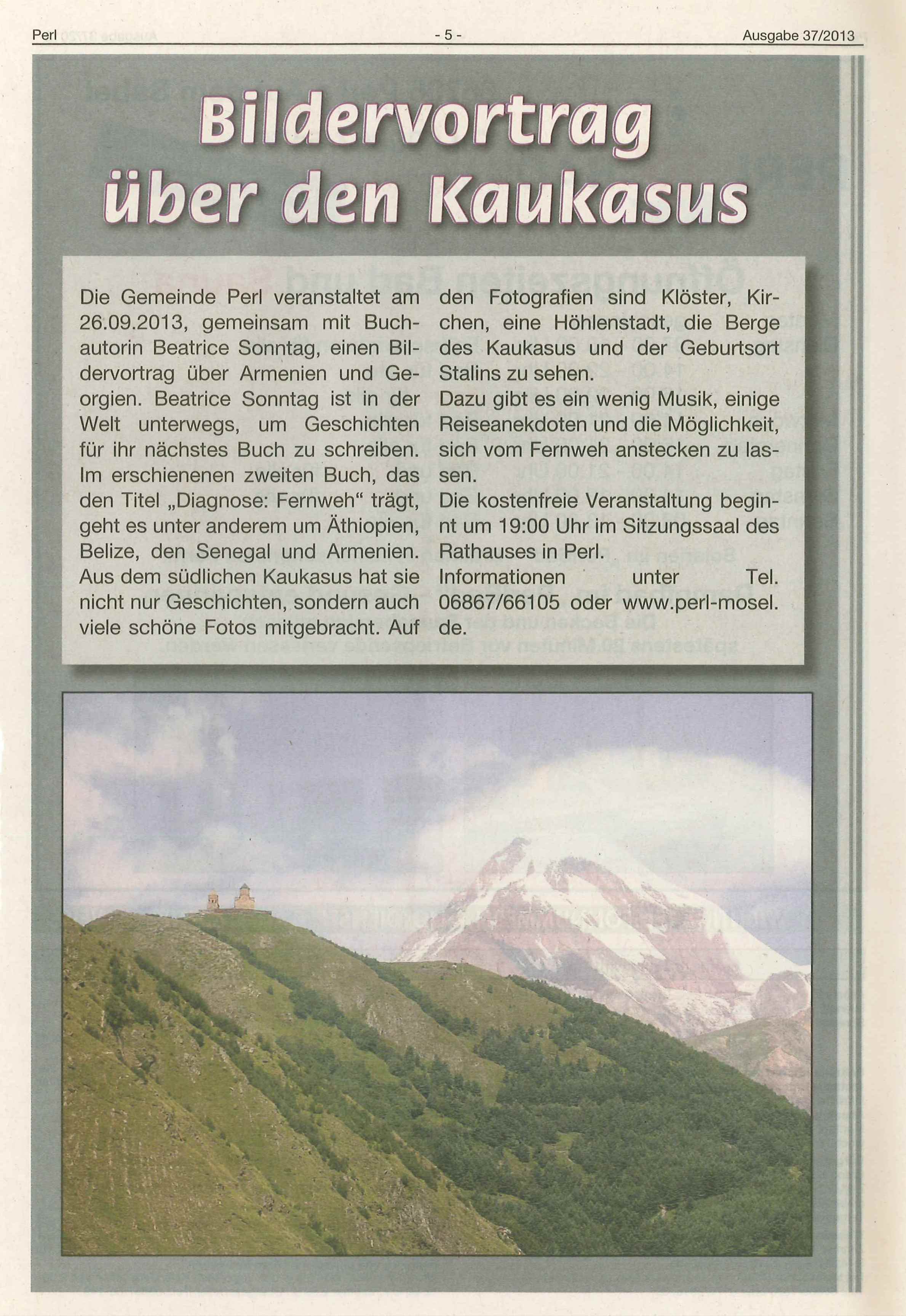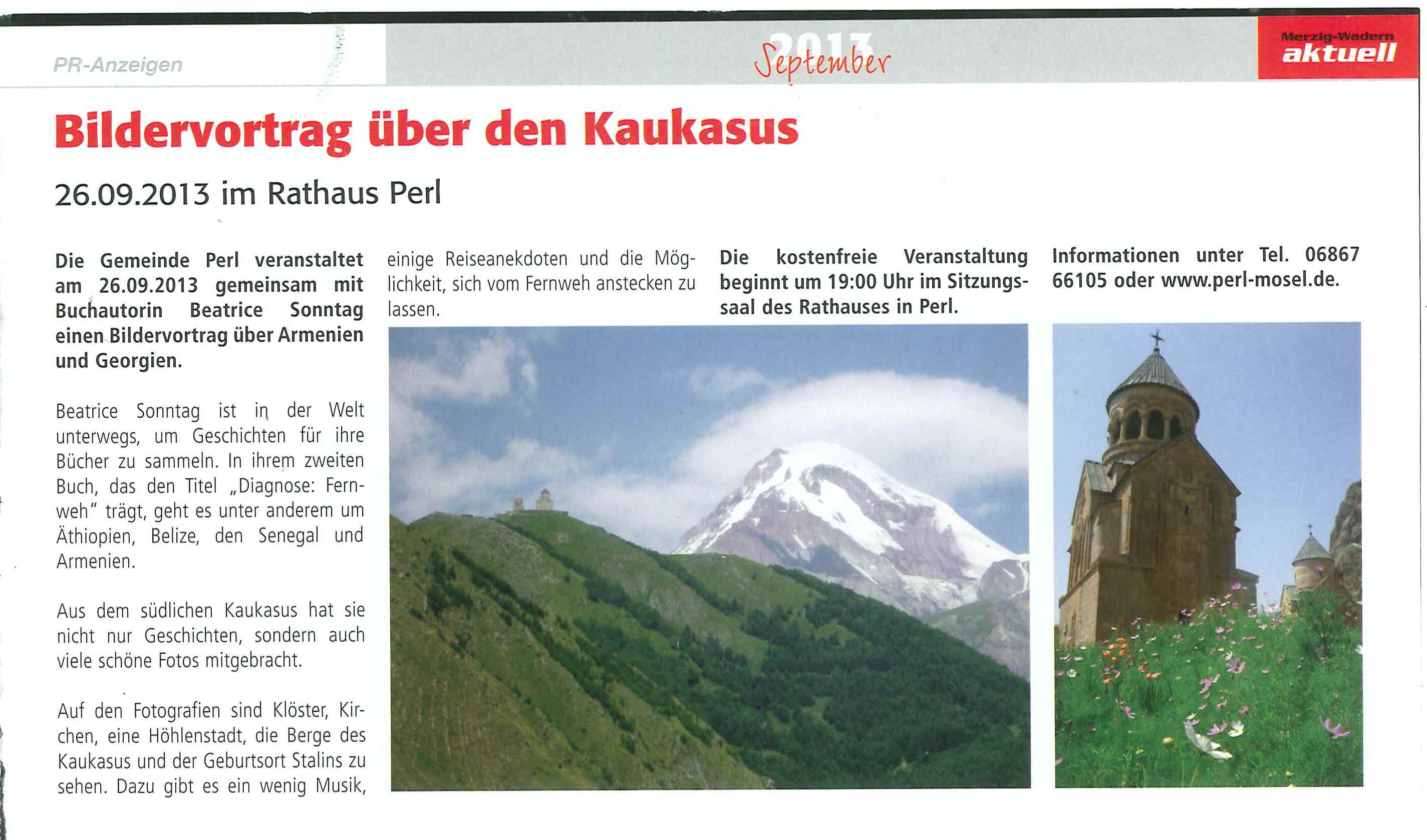 Vorankündigung des Bildervortrags über Armenien und Georgien in Perl im September 2013: