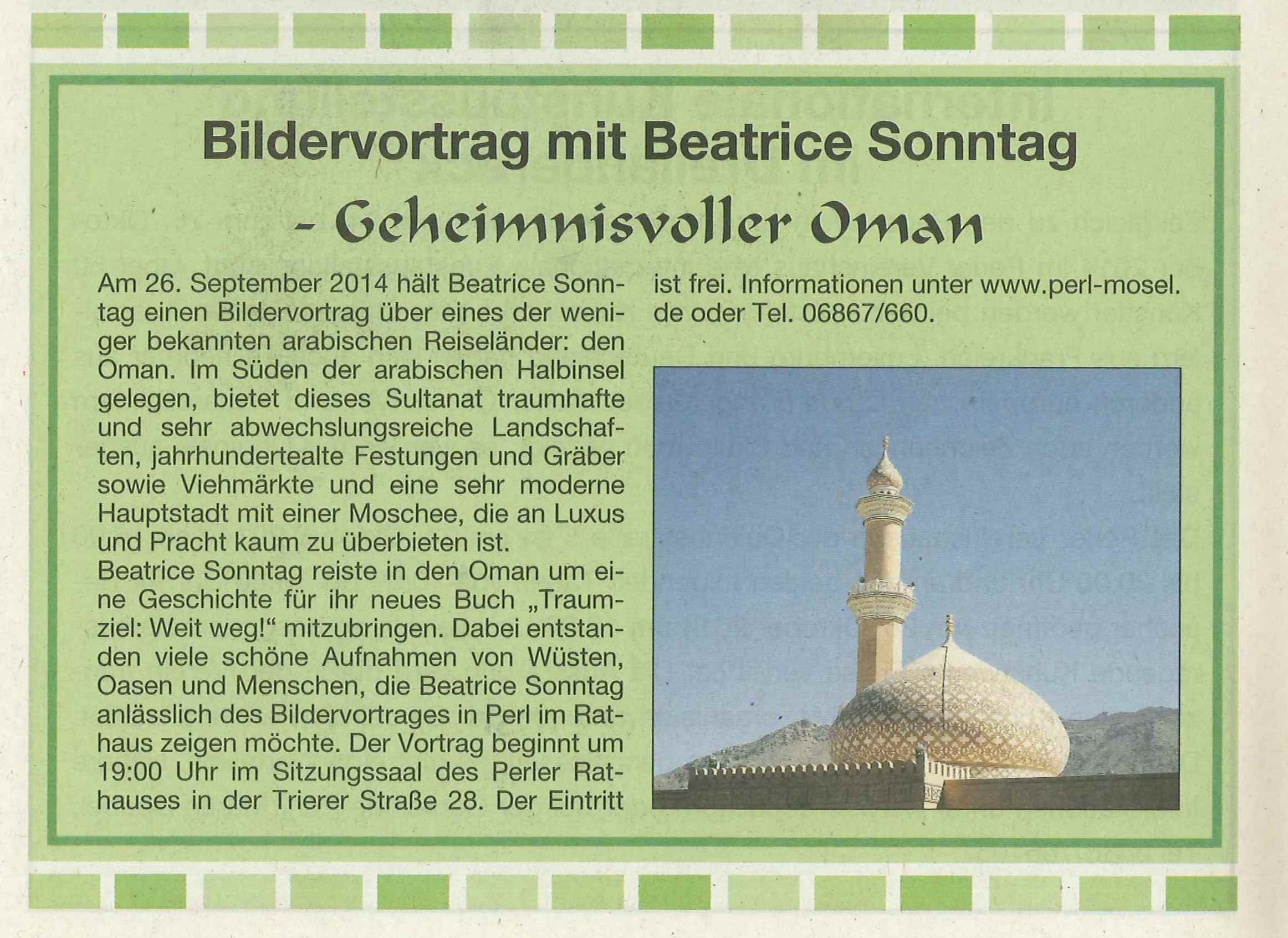 Ankündigung des Bildervortrags über den Oman im September 2014: