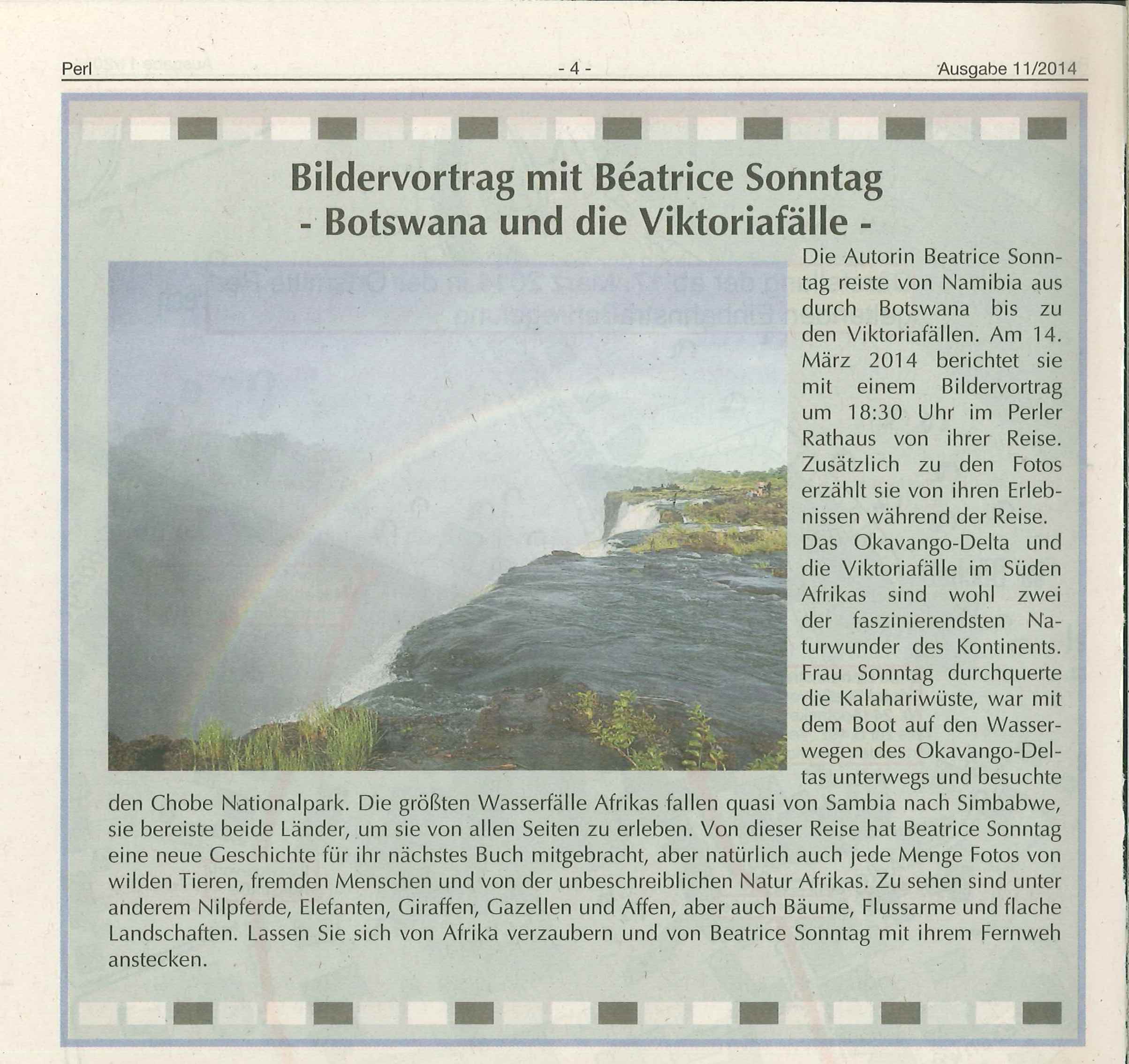 Vorankündigung des Bildervortrags über Botswana und die Viktoriafälle in Perl im März 2014: