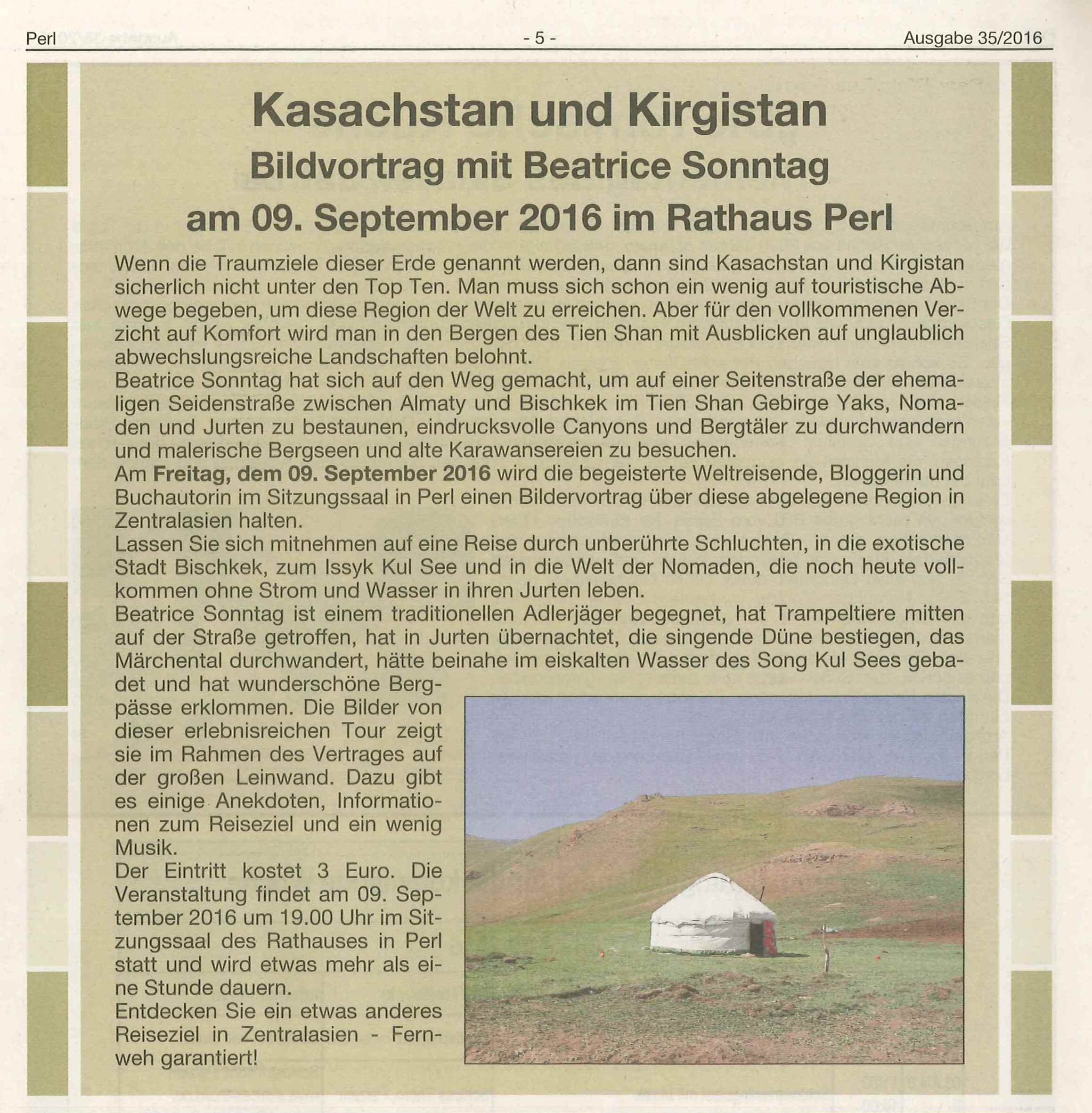 Ankündigung des Bildervortrages über Kasachstan und Kirgistan im Perler Amtsblatt Mosella: