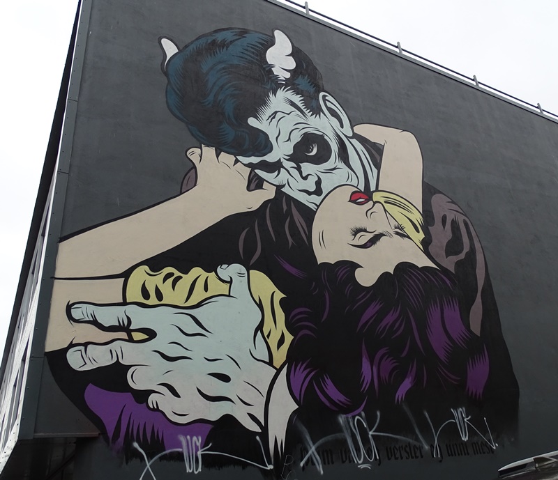 Vor einigen Jahren war ich schon einmal in Reykjavik. Schon damals dachte ich, dass die Stadt im Vergleich mit anderen nordischen Städten durchaus noch deutlich bunter sein könnte. Es gibt zwar einige schöne Häuser, die in knalligen Farben gestrichen sind und auch ein paar schöne Graffiti, aber die sind jeweils so über die Stadt verteilt, dass es nur vereinzelte Ecken sind, wo sich tolle Fotos schießen lassen. Da wurde in den vergangenen acht Jahren kaum nachgebessert. Eine ganze Straße, also der Asphalt selbst, wurde begrüßenswerterweise in den Farben des Regenbogens angemalt. Das macht schon etwas daher!
