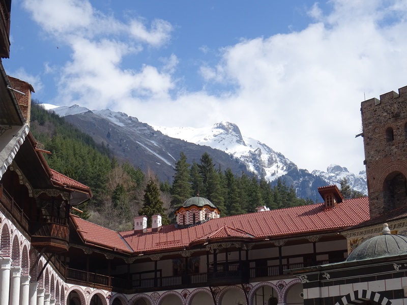 Das Rilas Kloster liegt malerisch im Gebirge zwischen Gipfeln, die Mitte April noch immer schneebedeckt sind. Es trägt den Namen von Sankt Ivan Rilski oder Sankt Johann von Rilas oder Saint John, der als der Klostergründer gilt. Er lebte im 10. Jahrhundert und er war als Kind schon etwas merkwürdig. So spielte er zum Beispiel nie mit anderen Kindern, sondern verbrachte seine Zeit damit, in die Kirche zu gehen und die Bibel zu studieren. Als er 25 Jahre alt war, starben seine Eltern. Nun hielt ihn nichts mehr davon ab, seiner Merkwürdigkeit freien Lauf zu lassen. Er spendete das gesamte Familienvermögen der Kirche und zog sich in die Berge zurück.