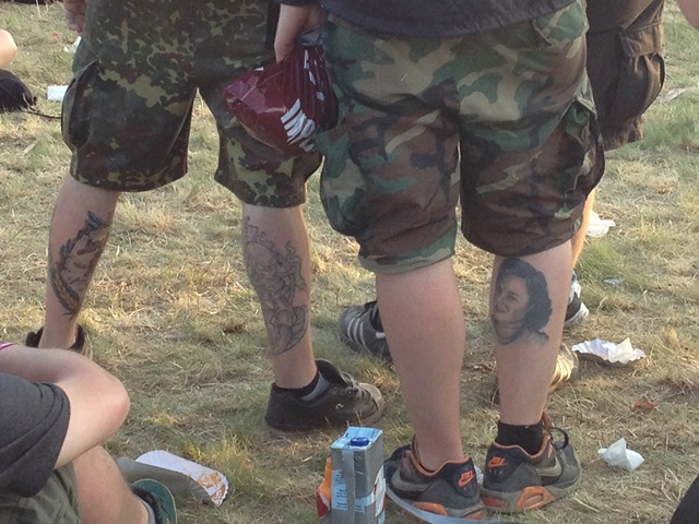 Auf dem Festivalgelände laufen auch bei Rock am Ring 2015 die üblichen Gestalten herum. Ich sehe einen Mann im Einhornkostüm, eine dickliche Biene, mehrere Drachen und rosa Bärchen sowie eine Menge Menschen, die kryptische Botschaften auf großen Pappschildern verbreiten. Ein junger Mann trägt nichts als eine Badehose und ein Wolfsfell. Ein anderer schwingt voller Begeisterung eine schwedische Flagge. Als eine Frau von der Bühne aus die Frage „Wer von euch hat geduscht?“ in die Menge schreit, heben sich erschreckend wenige Hände!
