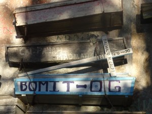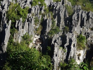 Nach Sagada kommen Menschen, um sich Särge anzuschauen. Kein Scherz! Es gab und gibt hier noch immer den Brauch, die Toten in Särge zu betten (soweit ist das ja nicht außergewöhnlich) aber dann hängen die Menschen diese Särge an möglichst exponierter und schwer zugänglicher Stelle an eine Felswand. Verschiedene Särge sind auch in Höhlen aufeinander geschichtet. Leider sind die Menschen in Sagada von diesem seltsamen Brauch fast ganz abgekommen. Vor fünf Jahren wurde der letzte Verstorbene so bestattet.