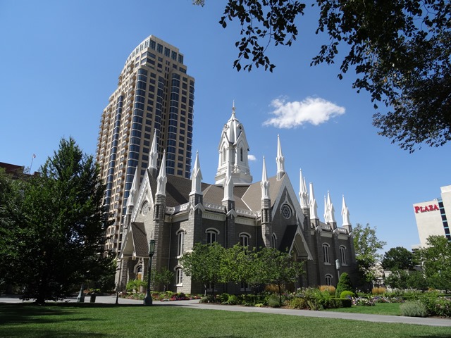 Es ist wenig überraschend, dass das Zentrum von Salt Lake City aus einem vier Hektar großen „Temple Square“. Hier stehen ein wirklich hübscher Mormonentempel, den Ungläubige leider nicht betreten dürfen, eine eindrucksvolle Konzerthalle, ein Museum, ein Ahnenforschungsinstitut, ein paar historische Bauten, ein riesiges Kongresszentrum sowie ein jeweils gigantisches Bank- und Verwaltungsgebäude. Alle Bauten gehören der Kirche Jesu Christi der Heiligen der Letzten Tage und man kann schon auf den ersten Blick erkennen, dass es sich um eine eher wohlhabende Religionsgemeinschaft handelt.