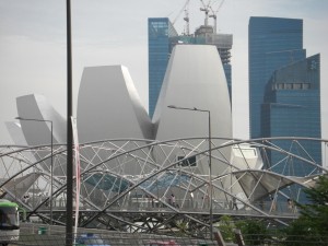 Mein Hotel ist sehr elegant. Es befindet sich über einem Shoppingcenter, was nichts ungewöhnliches ist, denn in Singapur gewinnt man den Eindruck, dass es keine Straße gibt, die ohne Shoppingcenter auskommt. Besonders eindrucksvoll ist das Marina Bay Sands, ein Hotel, das aus drei gigantischen Türmen besteht, auf denen, einem Schiff gleich, ein drittes Gebäudeteil “liegt” auf dem sich ein etwa einen Hektar großer Garten mit Pools und Sonnenliegen befindet. Dieses Luxushotel übersteigt jedoch mein Budget.