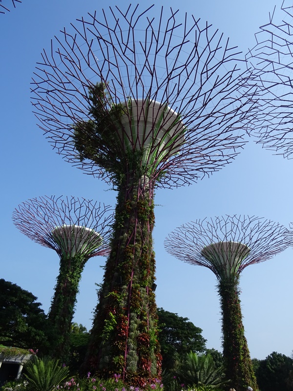 Ich bin ja normalerweise kein Fan von Gärten. Aber dieser ist einfach der Hammer. Es gibt ja nicht nur Blümchen und Bäume hier, sondern Super Trees. Und super sind die wirklich. Es handelt sich um riesige Bauwerke in der Form von Trichtern, die mit Grünzeug bewachsen sind und wie majestätische futuristische Türme im Garten aufragen. Am Abend sind sie noch eindrucksvoller als am Tag, vor allem um 19:45 und um 20:45, wenn eine pompöse Show mit Licht und Musik stattfindet. Wirklich sehenswert.