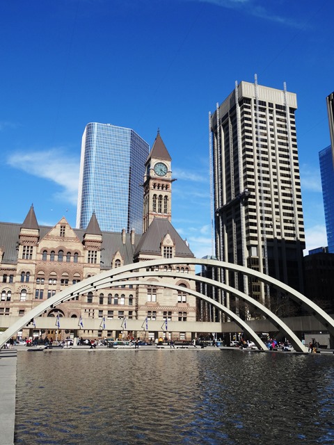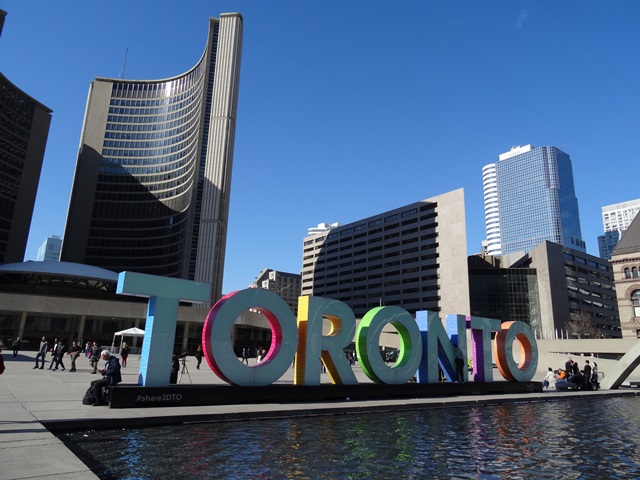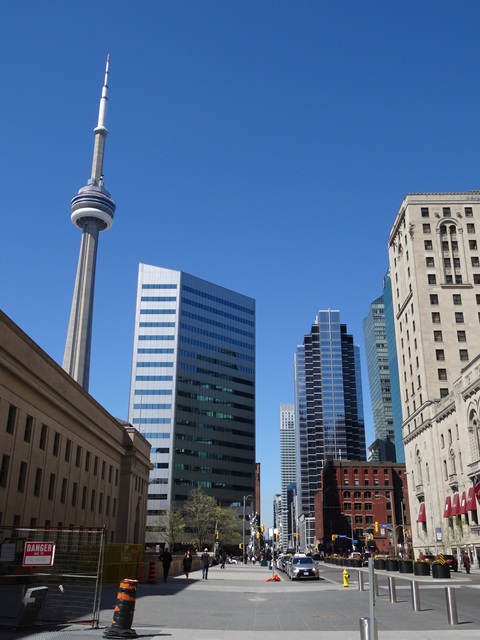 Am zweiten Tag scheint sich Toronto dann endlich dazu entschieden zu haben aus seinem nebligen Versteck hervor zu kommen. Bei strahlendem Sonnenschein und immerhin zwölf Grad zeigen sich nun die gigantischen Türme aus Glas, Stahl und Beton von ihrer schönsten Seite. Ich spaziere durch den Finanzdistrikt und muss aufpassen, dass ich meinen Blick nicht nur nach oben in Richtung der eindrucksvollen Hochhäuser, sondern hin und wieder auch mal auf den Bürgersteig oder die Straße richte. Auch der CN Tower ist nun zu erkennen. Er ragt aus der Masse der Gebäude heraus und ist auch von weither sichtbar.