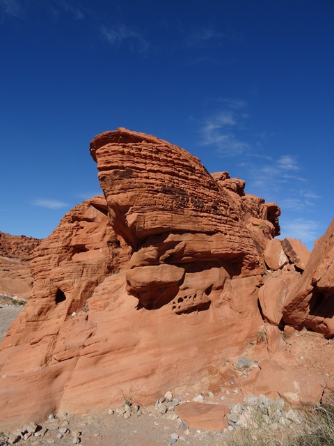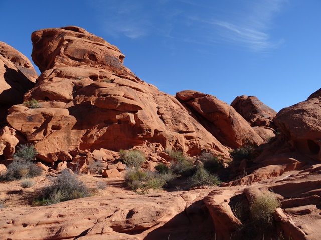 Ich bin am Südwestlichen Eingang ins Valley of Fire gefahren. Die ersten Felsformationen hier nennen sich Bee hive (also Bienenstock) und Atlatl Rock, was in einer der Indianersprachen das Wort für ein Wurfgeschoss ist. Der erste Eindruck des Valley of fire ist tatsächlich ziemlich feurig, denn die Felsen hier sind leuchtend rot, vor allem wenn die Sonne scheint. Ich habe Glück und sehe die roten Felsen vor einem strahlend blauen Himmel in der Sonne strahlen. Am Atlatl Felsen gibt es die ersten Petroglyphen zu sehen, die zum großen Teil tatsächlich von den hier lebenden Ureinwohnern des Kontinents stammen sollen.
