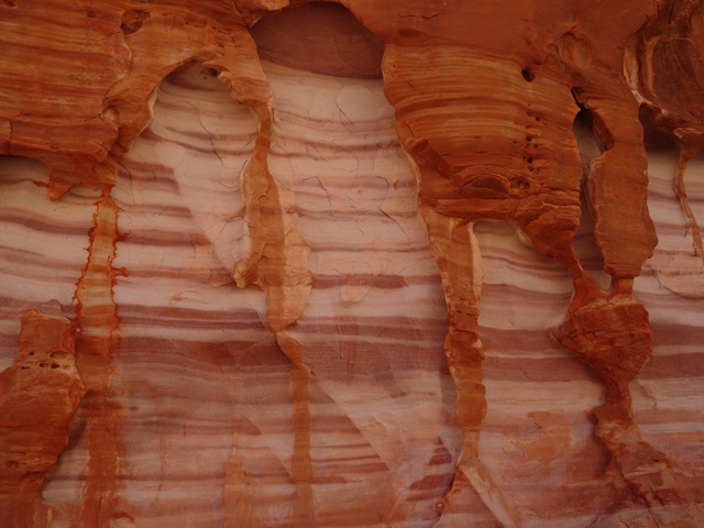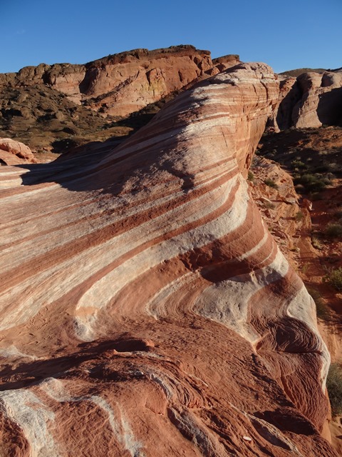 Die Hauptattraktion des Valley of fire State Park ist wohl die Fire Wave, die Feuerwelle. Hier gibt es einen weiteren Wanderweg von etwa drei Kilometern, der über felsiges Gebiet führt hin zu einem lustig gedrehten Felsen, der die Maserung eines Marmorkuchens in Weiß und Rot hat. Zwei asiatische Touristinnen werden nicht müde, sich gegenseitig auf diesem interessanten Stück Fels zu fotografieren, bis ein alter Mann sie mit rüden Worten verjagt. „Ich kann nicht ewig mit meinem Fotoapparat hier warten. Ich bin alt. Ich könnte jeden Moment sterben. Also darf ich auch unhöflich sein“, sagt er zu mir und macht dann den Weg frei, damit ich mein Foto machen kann – ganz ohne posende Asiatinnen.