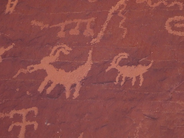 Die Wanderwege Mouse’s Tank und Rainbow Vista sind beide in etwa einer dreiviertel Stunde zu bewältigen. Auf dem Weg zum Mouse’s Tank, einem kleinen Wasserloch, an dem sich einst ein gesuchter Verbrecher versteckt haben soll, gibt es viele Petroglyphen zu sehen und sogar ein paar „Vorschläge“ für ihre Übersetzung. Tatsächlich weiß niemand, was sie bedeuten sollen, bis vielleicht auf die, die ziemlich eindeutig ein Dickhornschaf zeigen. Mit dem richtigen Begleiter und ein wenig Fantasie kann die Deutung der Symbole viel Spaß machen. Die Felsen am Rainbow Vista Trail sind sehr bunt, wie es sich für einen Regenbogen gehört.