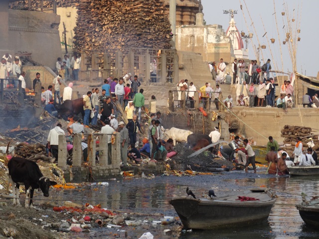 Und dann gibt es noch die tausenden von Menschen, die jeden Tag hier im Ganges baden. Fünfmal muss man untertauchen um die Vergebung aller Sünden zu erlangen. Das Wasser des Flusses ist hier in Varanasi jedoch so dreckig, dass ich es nicht einmal wagen würde, einen Fuß hinein zu setzen. Menschliche und tierische Leichen sowie Tonnen von Abfällen schwimmen vorbei. Der Ganges hier ist kein Vergleich mit dem sauberen und wunderschönen Fluss, den ich einige Tage zuvor in Haridwar gesehen habe. Dort erreicht er, aus dem Himalaya kommend die Ebene und auf den kommenden paar hundert Kilometern wird er zu einem Abwasserkanal.
