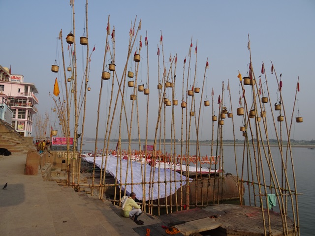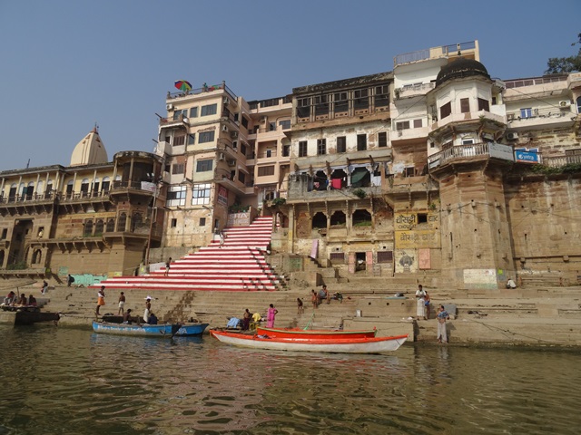 Das gesamte Ufer des Ganges ist mit den Ghats, den Stufen zum Wasser hin, gesäumt. Ein Ghat wird zum Wäschewaschen benutzt; an einem anderen findet jeden Abend eine lärmende religiöse Zeremonie statt, bei der fünf Brahmanenpriester Feuer und Räucherwerk schwenken. An den anderen Ghats streifen Kühe und Wasserbüffel umher. Heilige Männer verteilen Bindis und verdienen sich dadurch Geld, dass sie die Gläubigen segnen.