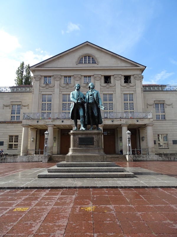 Selbstverständlich muss man sich Goethe und Schiller anschauen, die in trauter Zweisamkeit vor dem Theater stehen. Lustigerweise sind beide gleich groß. Nett vom Künstler. Schiller war mehr als 30 Zentimeter größer als Goethe, aber das sollte natürlich nicht für die Ewigkeit so sein. Schließlich war Goethe der große Meister und der Macher in Weimar.
