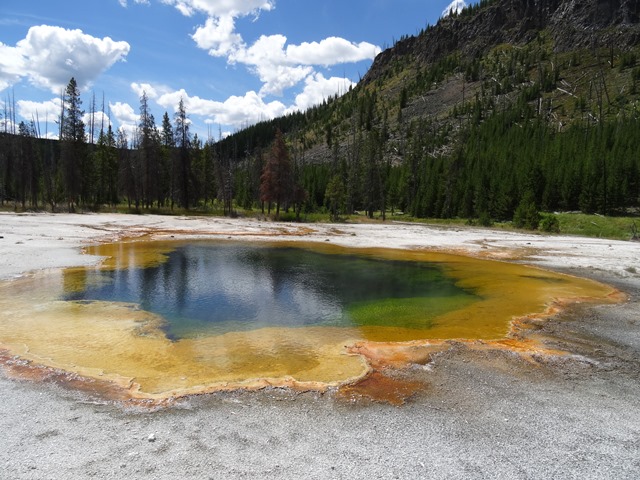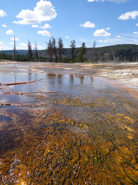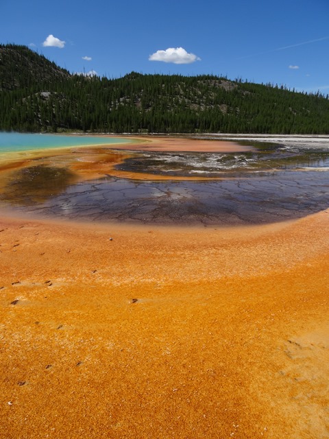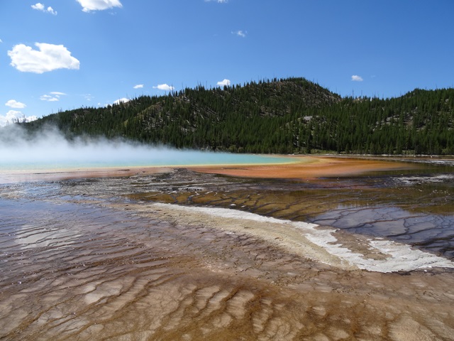 In den kommenden Tagen erkunde ich mit dem Mietwagen das Innere des Nationalparks. Nach wenigen Kilometern überquere ich die Grenze zwischen Montana und Wyoming und nähere mich den berühmten Geysiren. Wenn man nach 14 Meilen rechts abbiegt, liegen die schönsten Geysir-Bassins zur Rechten. Es ist einfach unglaublich, wieviel Farbe auf dieser Erde einfach so in der Natur entstehen kann.